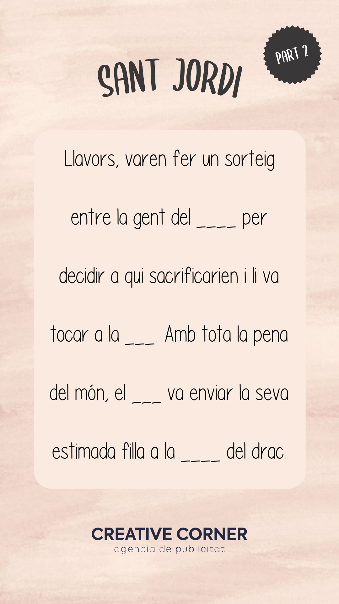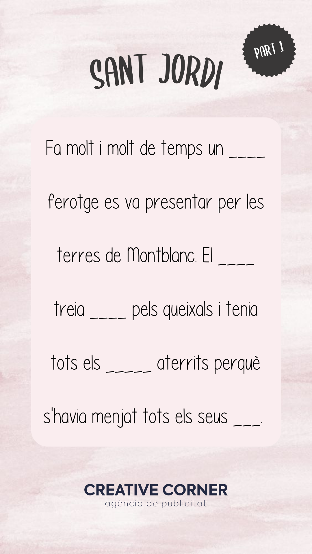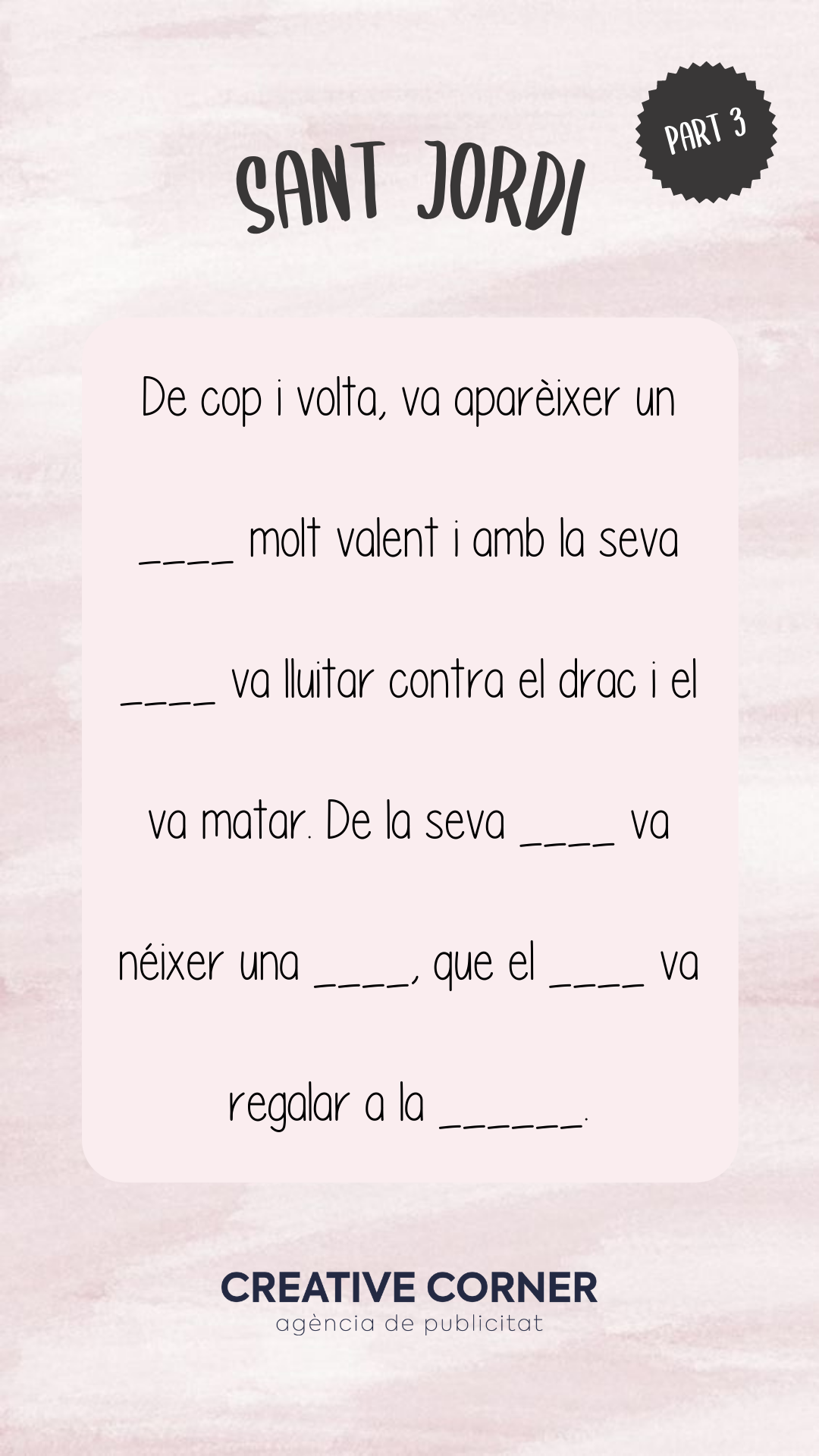 Aquest Sant Jordi, us portem un repte molt especial. Amb les plantilles descarregables, tindreu l’oportunitat de personalitzar la llegenda de Sant Jordi, la qual consta de 3 parts. Us animem a descarregar totes les plantilles i publicar-les a vostre Instagram Stories!